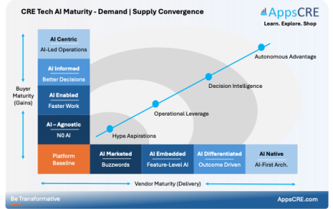 This graph from AppsCRE, LLC explores CRE Tech AI Maturity from both a Buyer and Vendor Maturity perspective.